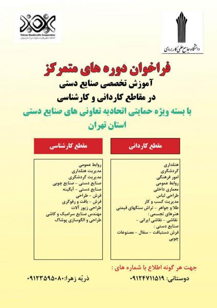 فراخوان دوره های متمرکز آموزش تخصصی صنایع دستی در مقاطع کاردانی و کارشناسی با بسته ویژه حمایتی اتحادیه تعاونی های صنایع دستی استان تهران